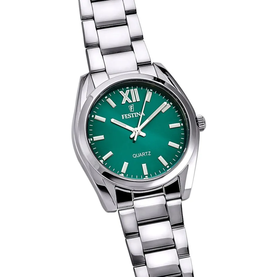 Montre Festina Boyfriend Acier Blanc Ronde Quartz 37mm Fond Vert Bracelet Acier Blanc F20622/c