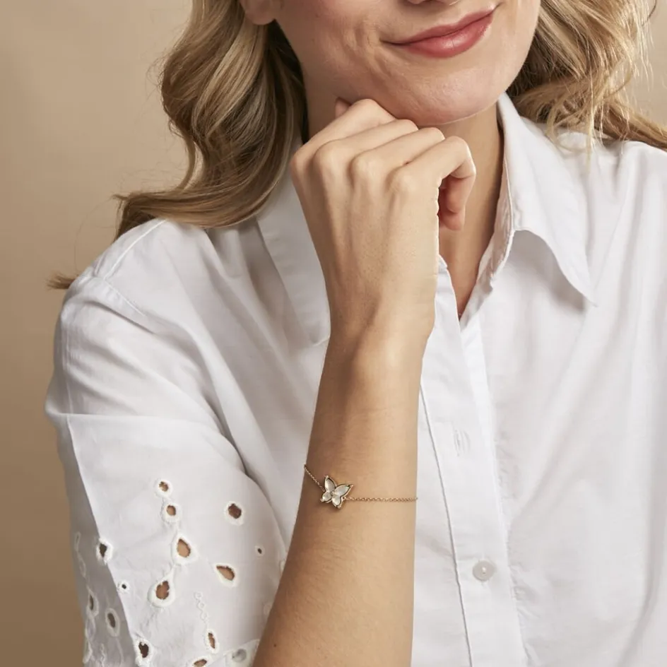 Bracelet Plaqué Or Papillon Nacre Blanche Oxydes De Zirconium Maille Forçat 19cm