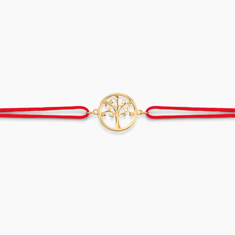 Bracelet Or Jaune 375/1000 Arbre De Vie Et Cercle Ajoure Sur Cordon Ajustable Nylon Rouge