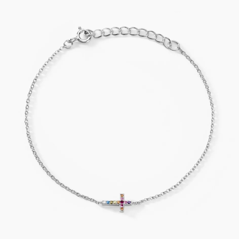Bracelet Argent 925/1000 haïvy Croix Pavage Oxydes De Zirconium Multicolore Maille Forcat 16+3cm