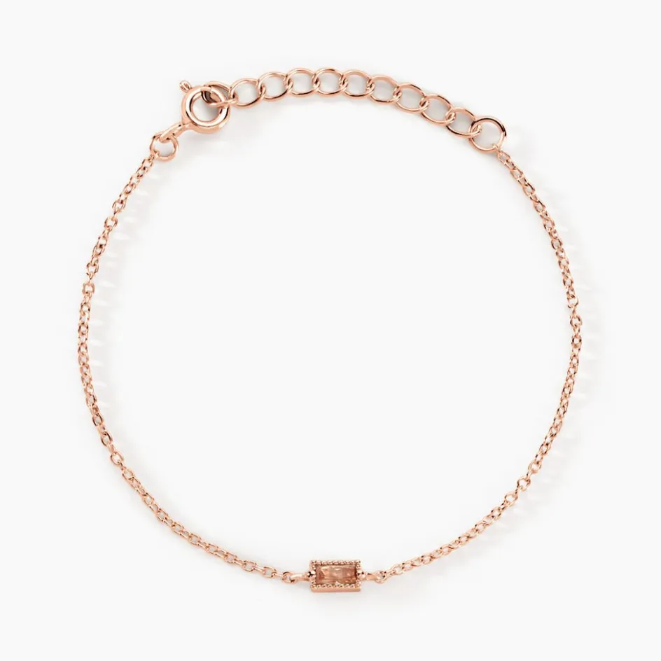 Bracelet Court Argent Rose 925/1000 Oxyde De Zirconium Champagne Forme Baguette Entourage Perlé Maille Forçat 13+3cm