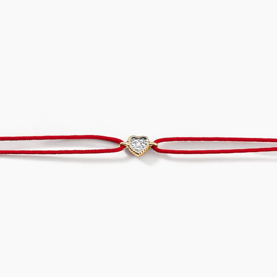 Bracelet Or Rose 375/1000 C艙ur Effet Perlé Et Diamant Cordon Rouge Ajustable
