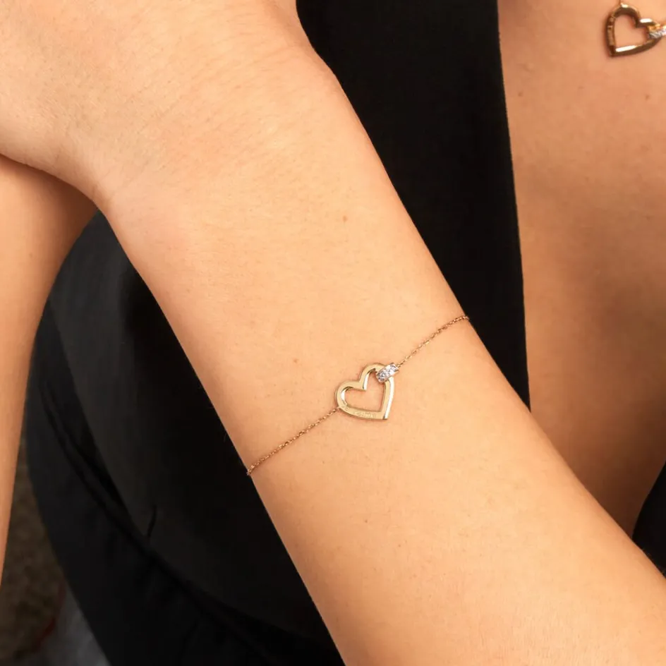 Bracelet Or Jaune 375/1000 C艙ur Ajoure Avec Message Je T’aime Pavage Diamants Maille Forcat 16+2cm