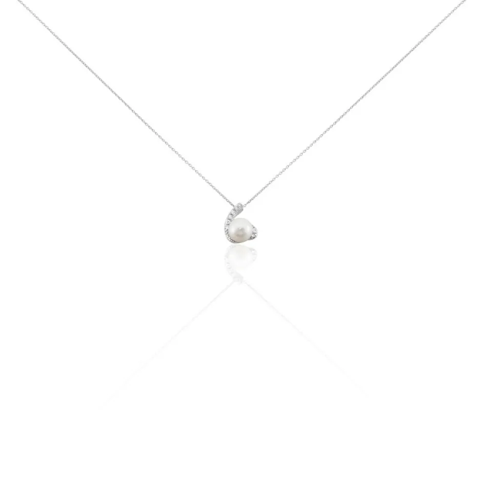 Collier Or Blanc 375/1000 Forme Goutte Perle De Culture 6-6.5mm Et Oxydes De Zirconium Maille Forçat 38+4cm