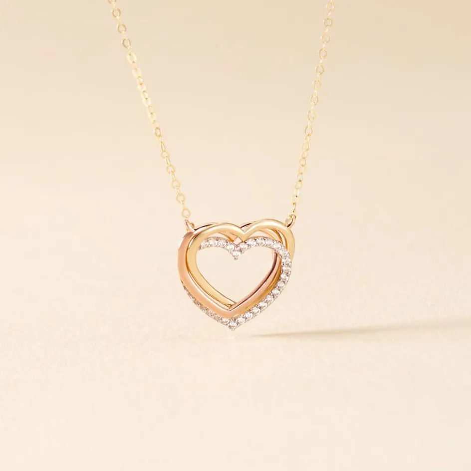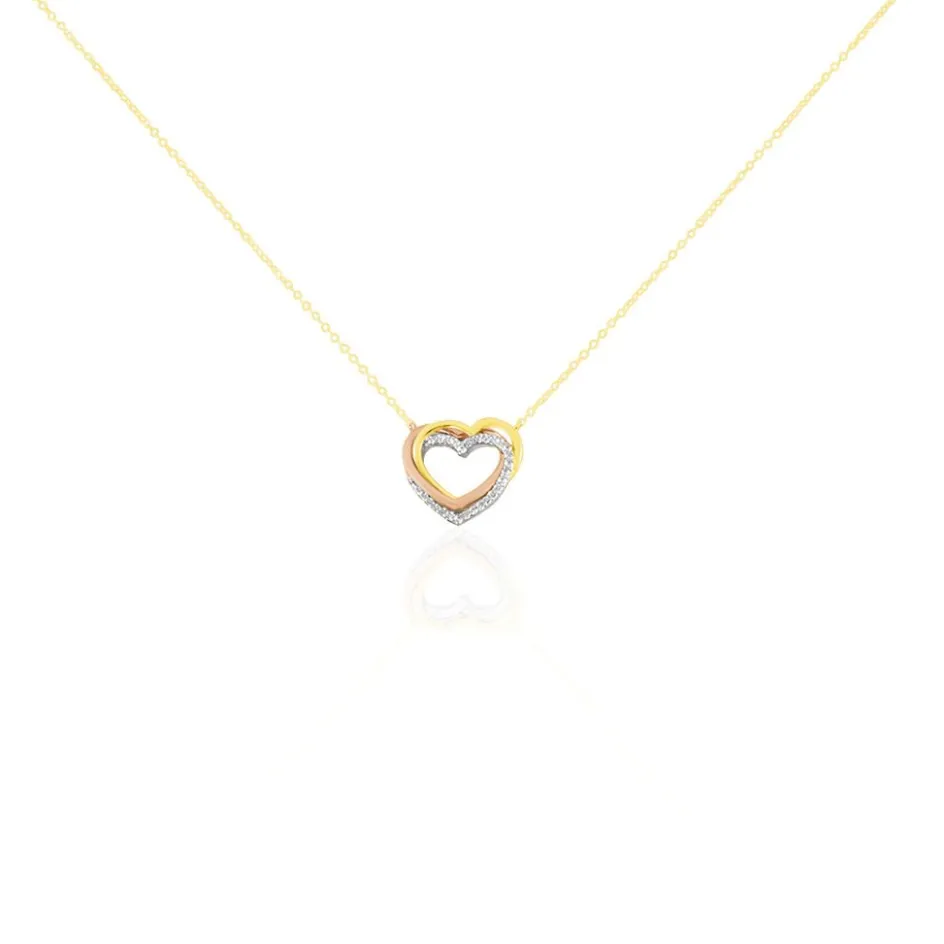 Collier Or Tricolore 375/1000 Chaine Forçat Or Jaune Triple C艙urs Micro Pavage Oxydes De Zirconium 40+2cm