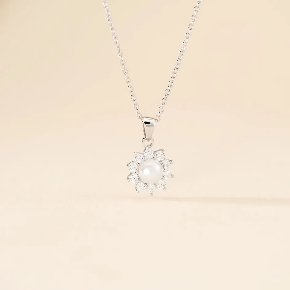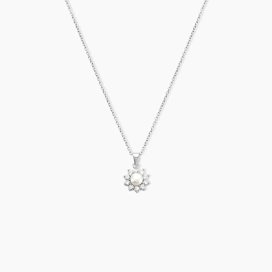 Collier Argent Blanc 925/1000 Fleur Perle De Culture Et Oxydes De Zirconium Sertis Griffes Maille Forçat 45cm