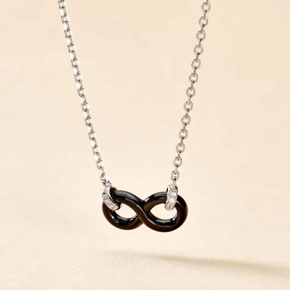 Collier Argent Blanc 925/1000 Motif Infini Ceramique Noire Et Oxydes De Zirconium 45cm