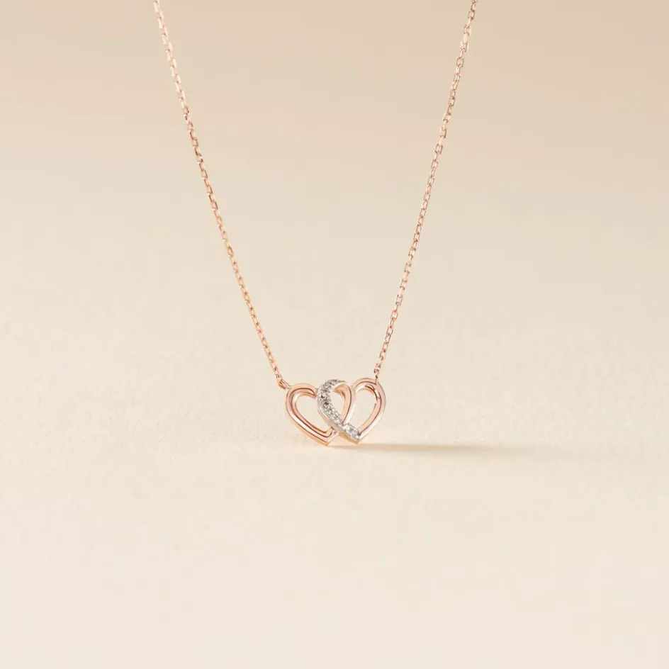 Collier Or Rose 375/1000 Forme Double C艙ur Maille Forçat Pavage Diamants 42cm