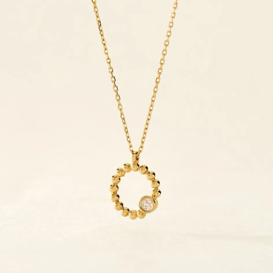 Collier Or Jaune 375/1000 Pastille Sur Cercle Effet Perle Pavage Diamants 0.015cts Maille Forcat 42+2cm