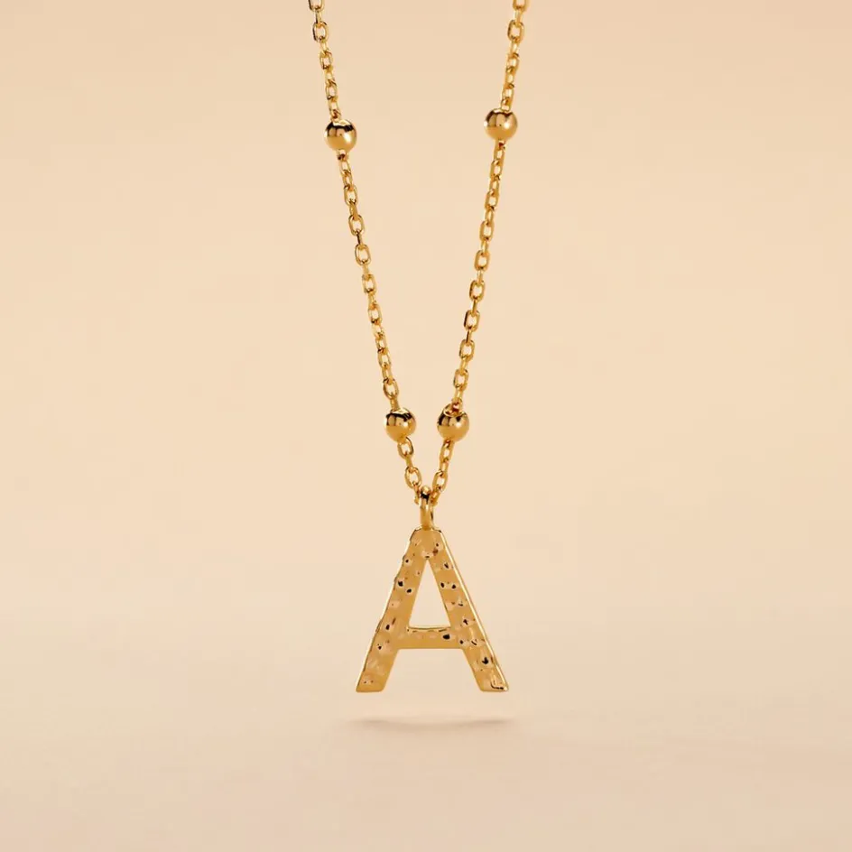 Collier Plaque Or Jaune Lettre A Martelee Et Petites Boules Chaine Maille Forcat Longueur 45cm