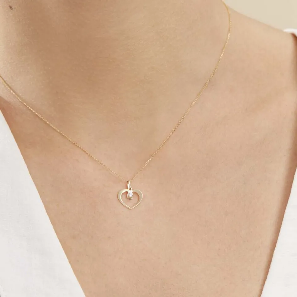 Collier Or Jaune 375/1000 Motif C艙ur Creux Avec Oxyde De Zirconium 42cm