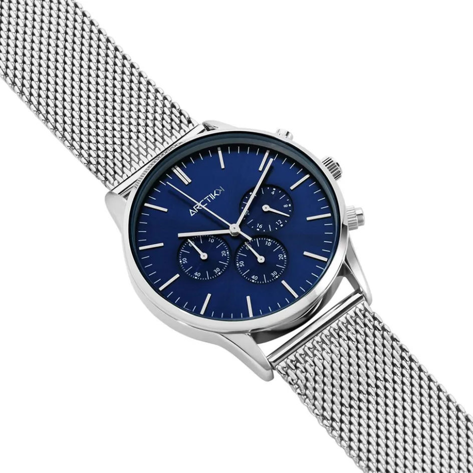 Montre Arctik Escale Alliage Argenté Ronde Quartz Chronographe 42mm Fond Bleu Bracelet Milanais Acier Argenté P100989-a