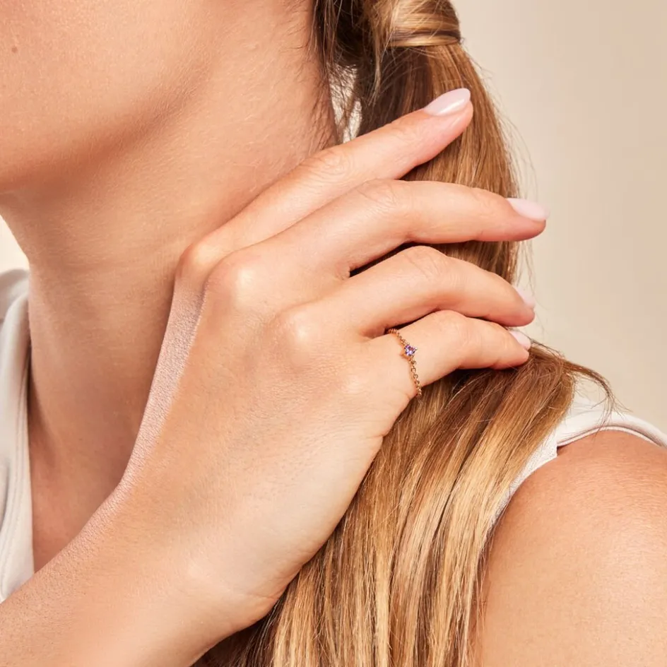 Bague Chaîne Plaqué Or Jaune Oxyde De Zirconium Violet Serti Griffes Maille Forçat