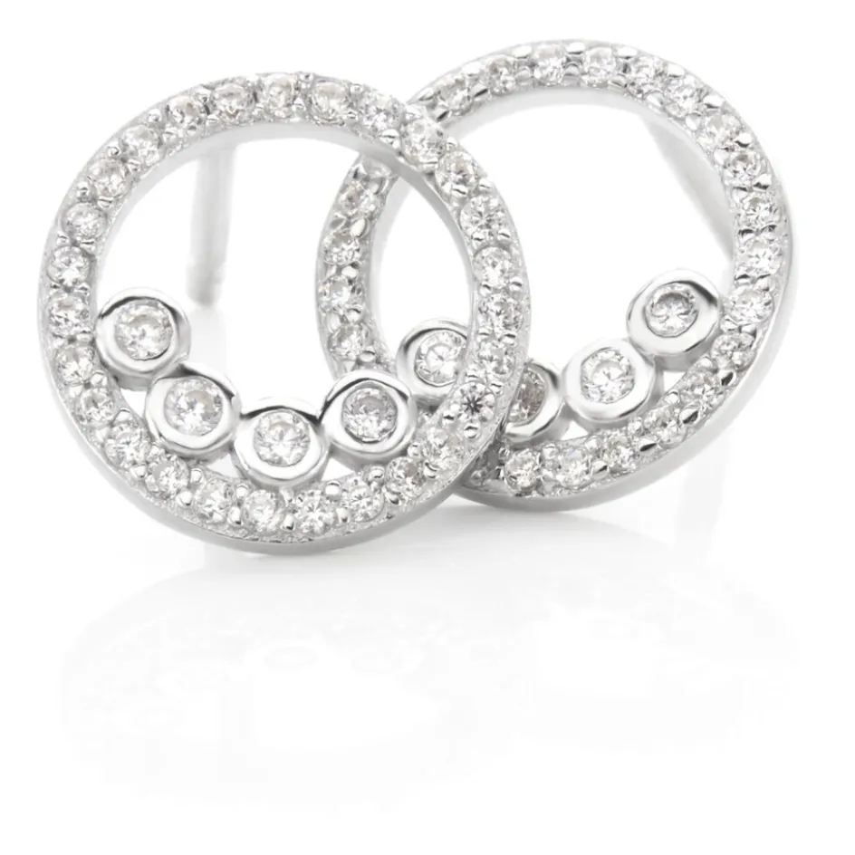 Boucles D’oreilles Puces Argent Blanc 925/1000 Cerles Pavage Et Serti Clos Oxydes De Zirconium