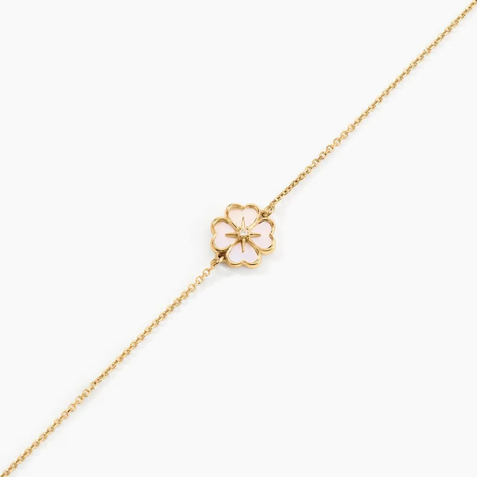 Bracelet Or Jaune 375/1000 Fleur De Trefle Nacre Blanche 1 Oxyde De Zirconium Serti 4 Griffes Maille Jaseron 16+2cm