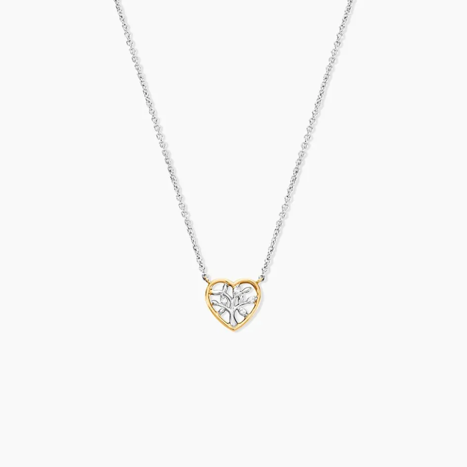 Collier Or Jaune 375/1000 Et Argent Blanc 925/1000 Arbre De Vie C艙ur Oxydes De Zirconium Blancs Maille Jaseron 42+3Cm
