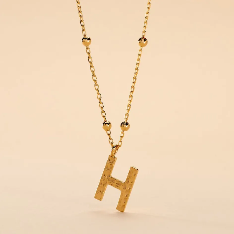Collier Plaque Or Jaune Lettre H Martelee Et Petites Boules Chaine Maille Forcat Longueur 45cm