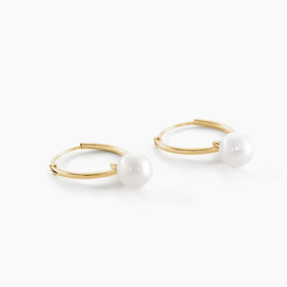 Creoles Or Jaune 375/1000 Perles De Cultures Rondes Blanches 6/7mm Diam 15mm