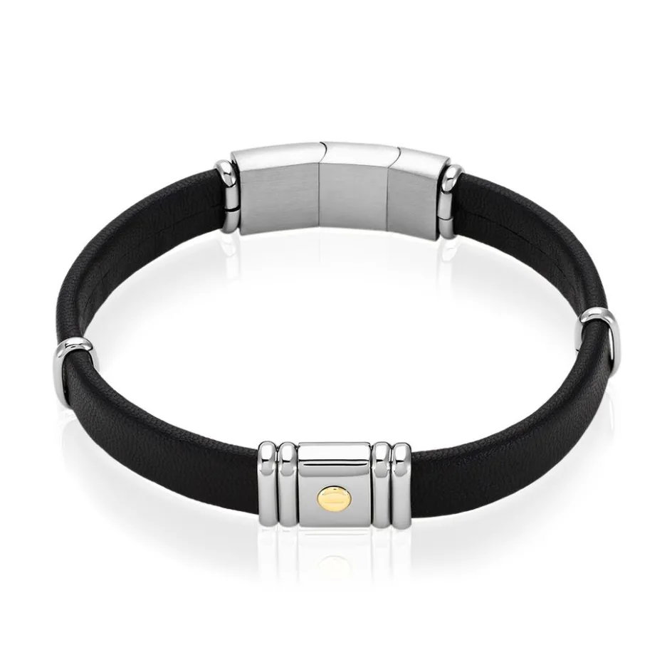 Bracelet Jourdan Homme Cuir Noir Acier Gris Decor Or 21.5cm Jh300006b