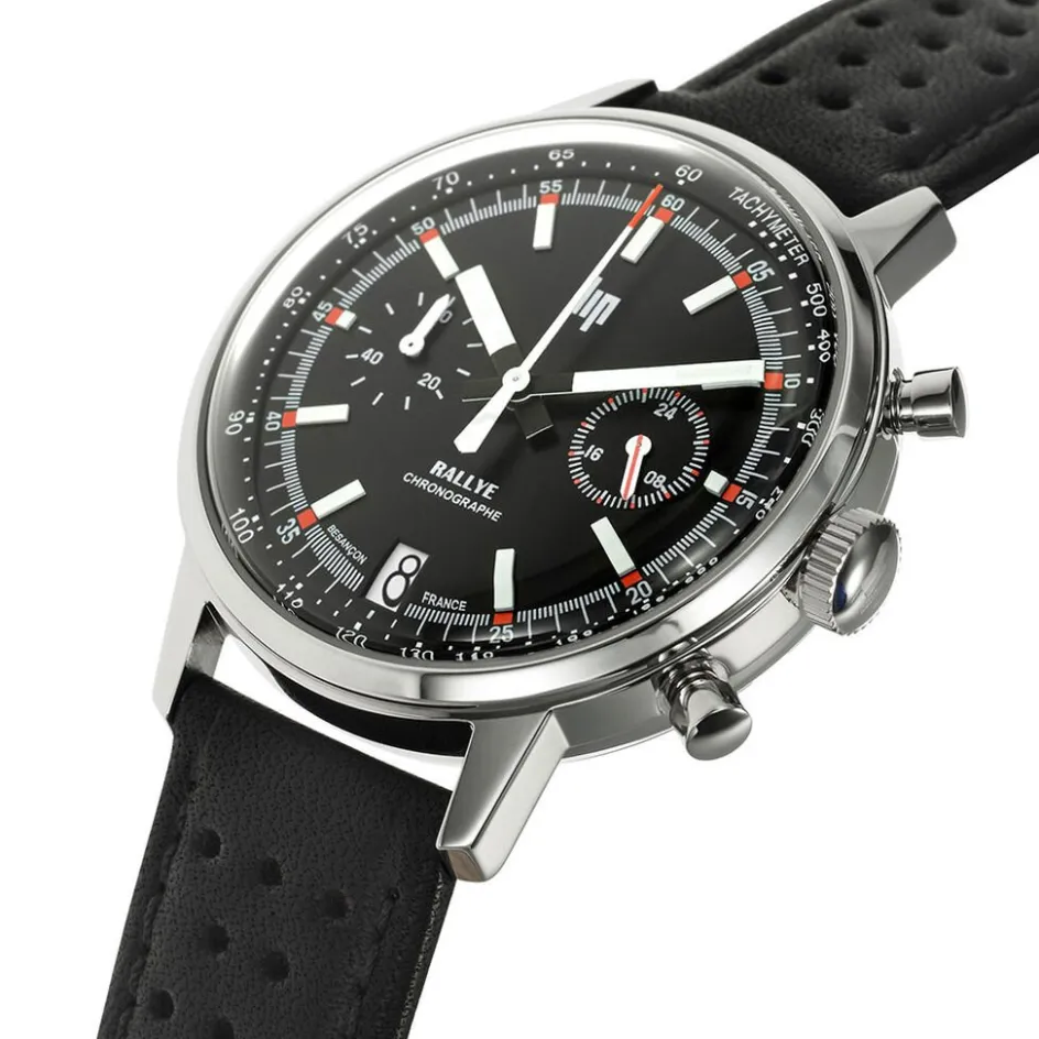 Montre Lip Rallye Meca Quartz Acier Inoxydable Argenté Quartz Chronographe Ronde 39Mm Fond Noir Bracelet Cuir De Veau Ajoure Noir 671808