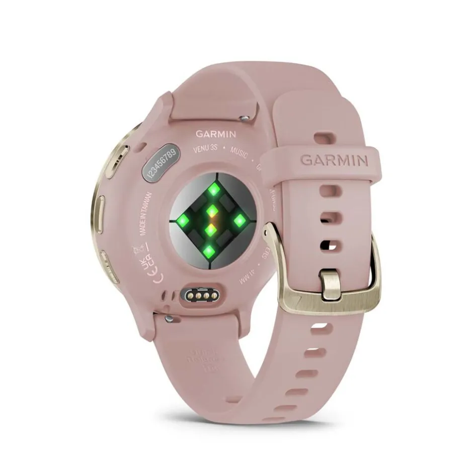 Montre Garmin Venu 3 Polymere Renforce De Fibres Rose Ronde Connectee Multifonctions 41mm Lunette Acier Dore Fond Noir Bracelet Silicone Rose 010-02785-03