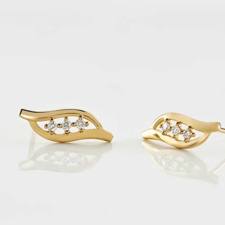 Boucles D’oreilles Or Jaune 375/1000 Feuille D’or Trilogie Diamants 0.0724cts