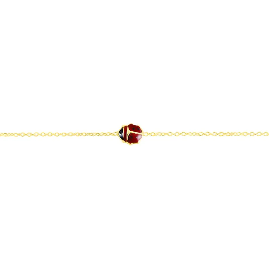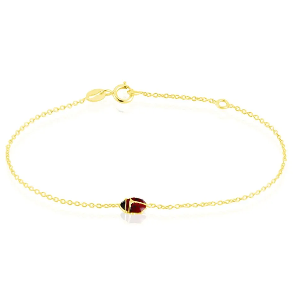 Bracelet Or Jaune 375/1000 Maille Vénitienne Coccinelle Smalto Rouge 14cm