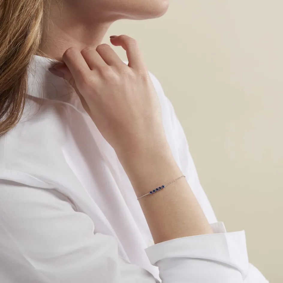 Bracelet Argent 925/1000 5 Oxydes De Zirconium Bleus Serti Griffes Effet Perlé Maille Forçat 19cm