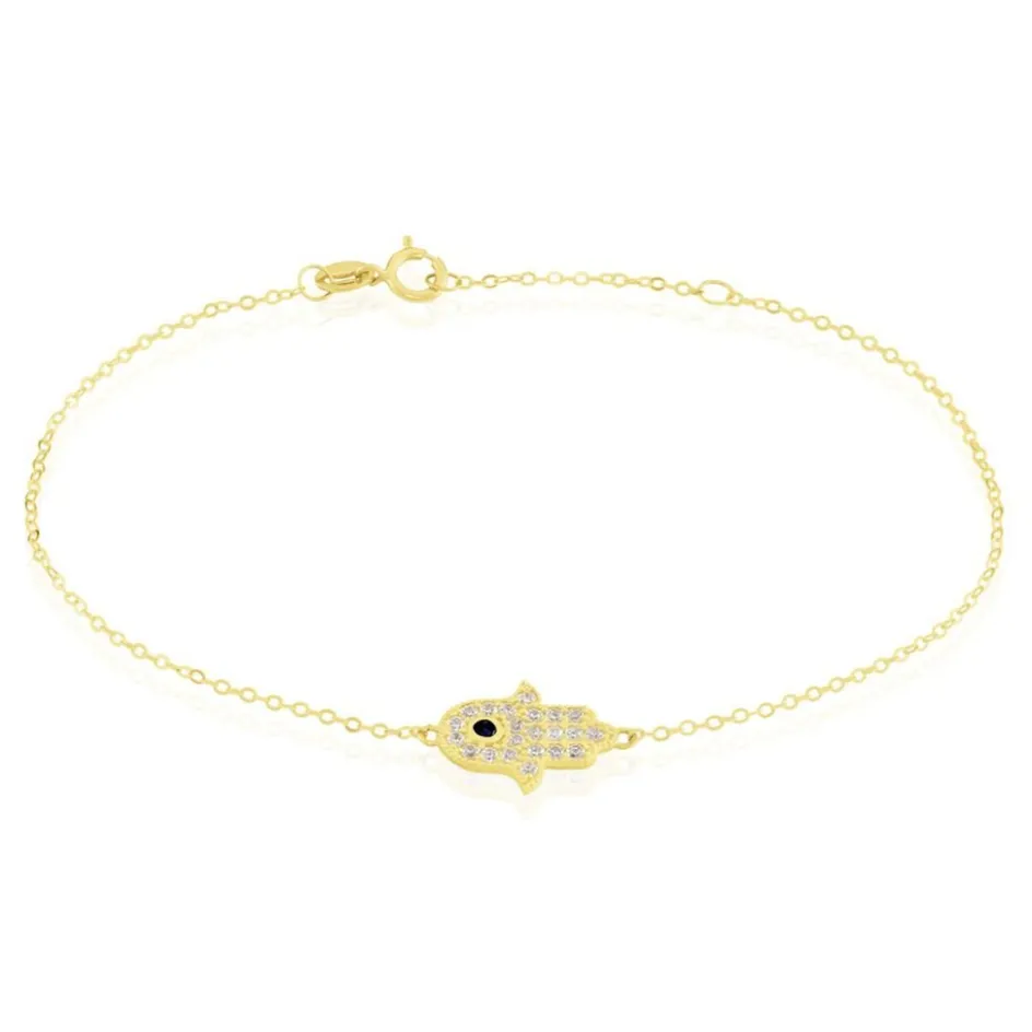 Bracelet Or Jaune 375/1000 Motif Main De Fatma Pavage Oxydes Blancs Et Bleu Maille Forçat 16+2 Cm