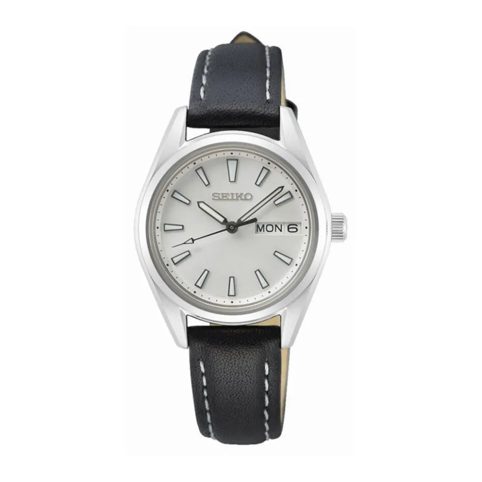 Montre Seiko Classique Acier Blanc Ronde Quartz 29.8mm Fond Blanc Bracelet Cuir Noir Sur455p1