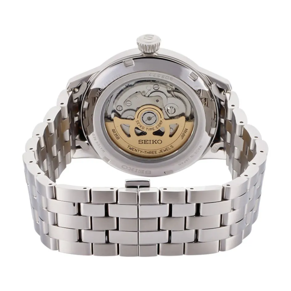Montre Seiko Presage Acier Blanc Ronde Automatique 40.5mm Fond Vert Bracelet Acier Blanc Srpe15j1