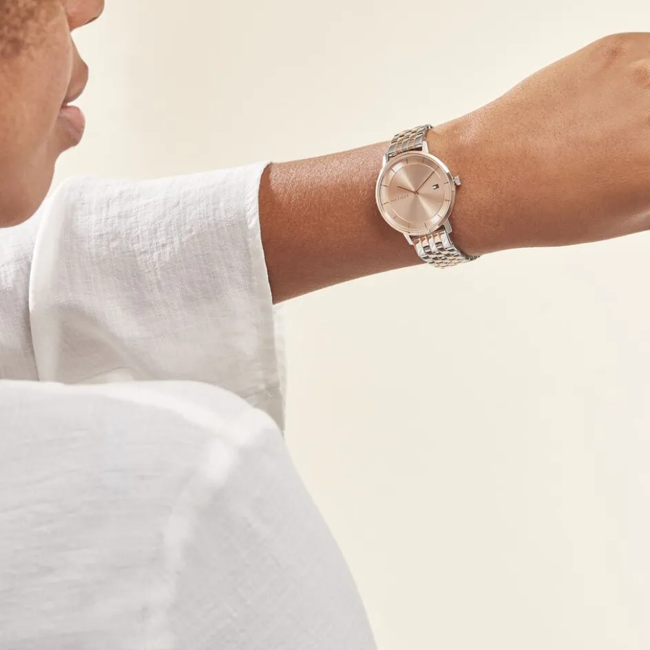 Montre Tommy Hilfiger Tea Acier Blanc Ronde Quartz 35mm Fond Rose Bracelet Acier Argenté E Rose 1782284