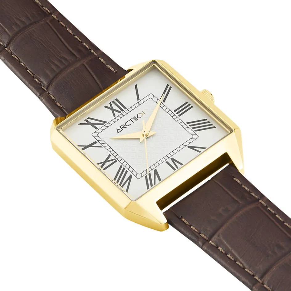 Montre Arctik Retro Acier Dore Carree Quartz 33mm Fond Blanc Bracelet Cuir Vache Effet Alligator Marron P101196-b