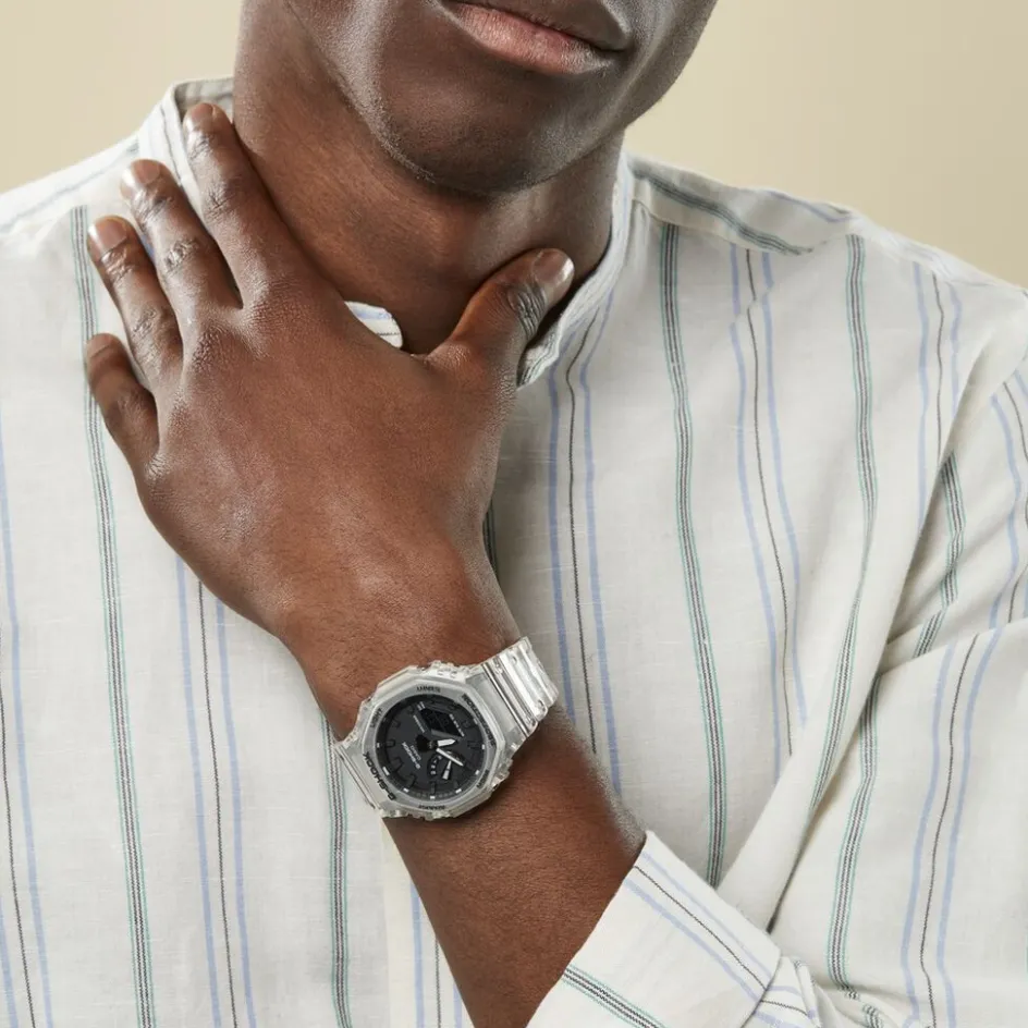 Montre Casio G-shock Résine Gris Ronde Quartz Multifonction 48mm Fond Noir Bracelet Résine Blanc Transparent Ga-2100ske-7aer