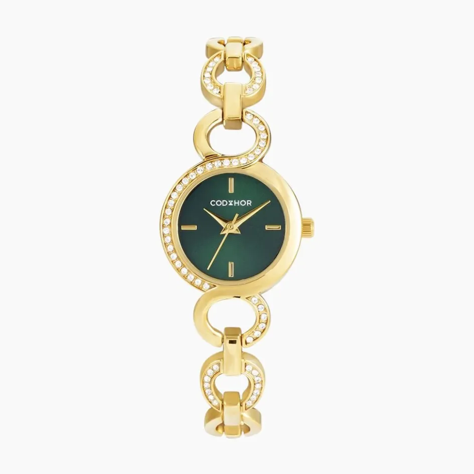 Montre Codhor Sarah Alliage Doré Ronde Quartz 24mm Lunette Strass Fond Vert Bracelet Alliage Doré Et Strass P100944-h