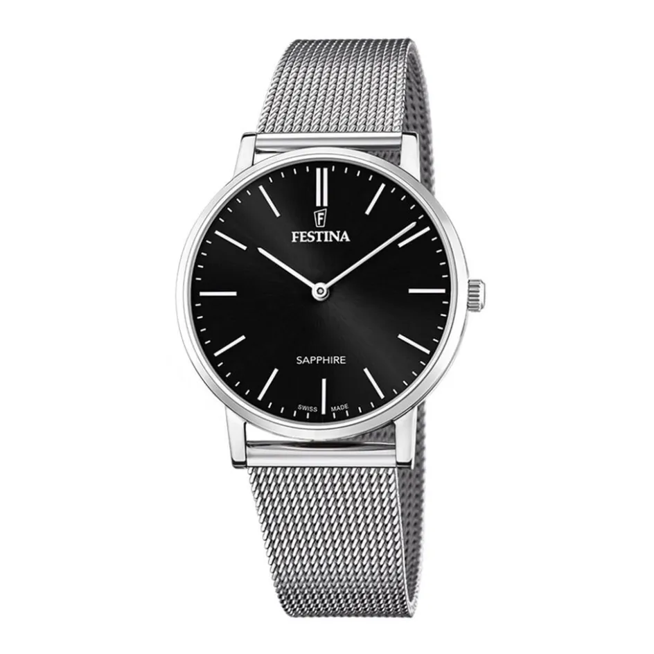 Montre Festina Swiss Made Acier Argente Ronde Quartz 39mm Fond Noir Bracelet Acier Milanais Argente F20014/3