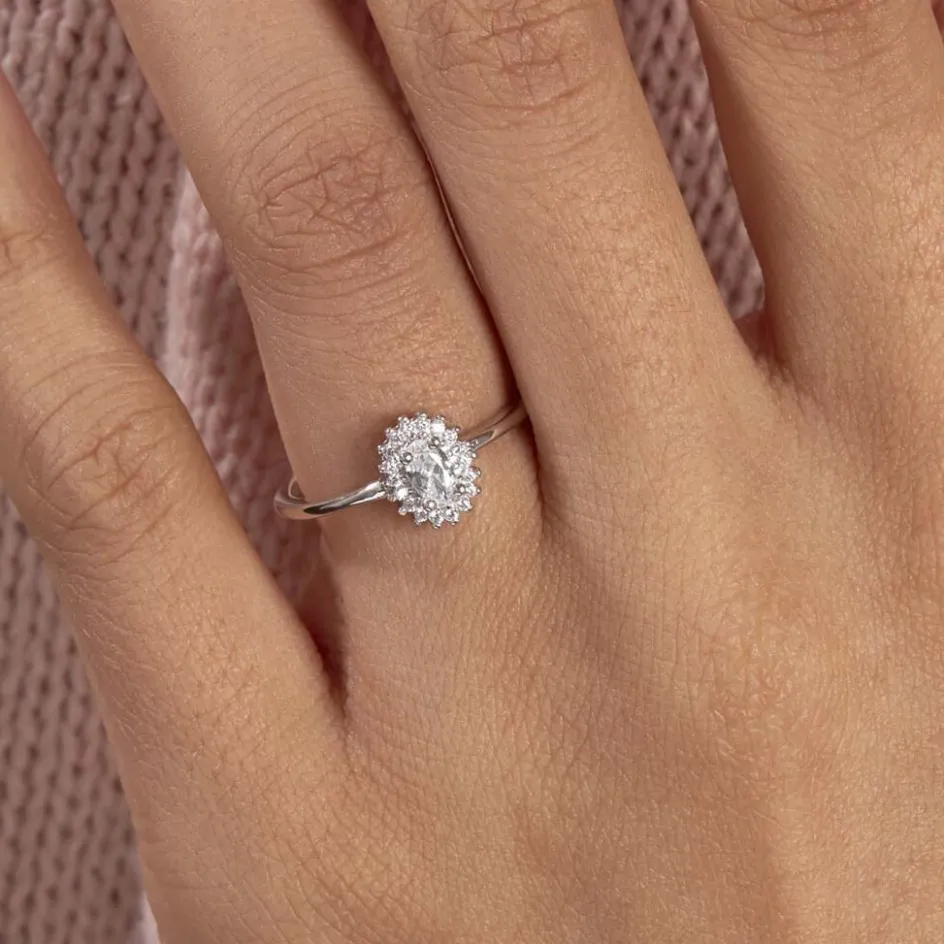 Solitaire Bague Argent Blanc 925/1000 Oxyde De Zirconium Central Forme Ovale Entourage Oxydes De Zirconium