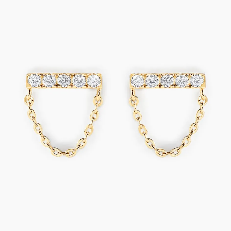 Boucles D’oreilles Pendantes Or Jaune 375/1000 Barre Oxydes De Zirconium Avec Chaine Sertis Griffes
