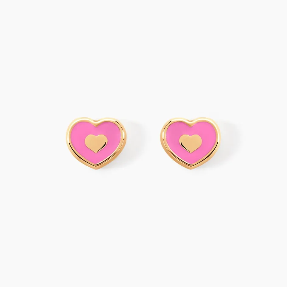 Boucles D’oreilles Puces Or Jaune 375/1000 Coeurs Email Rose