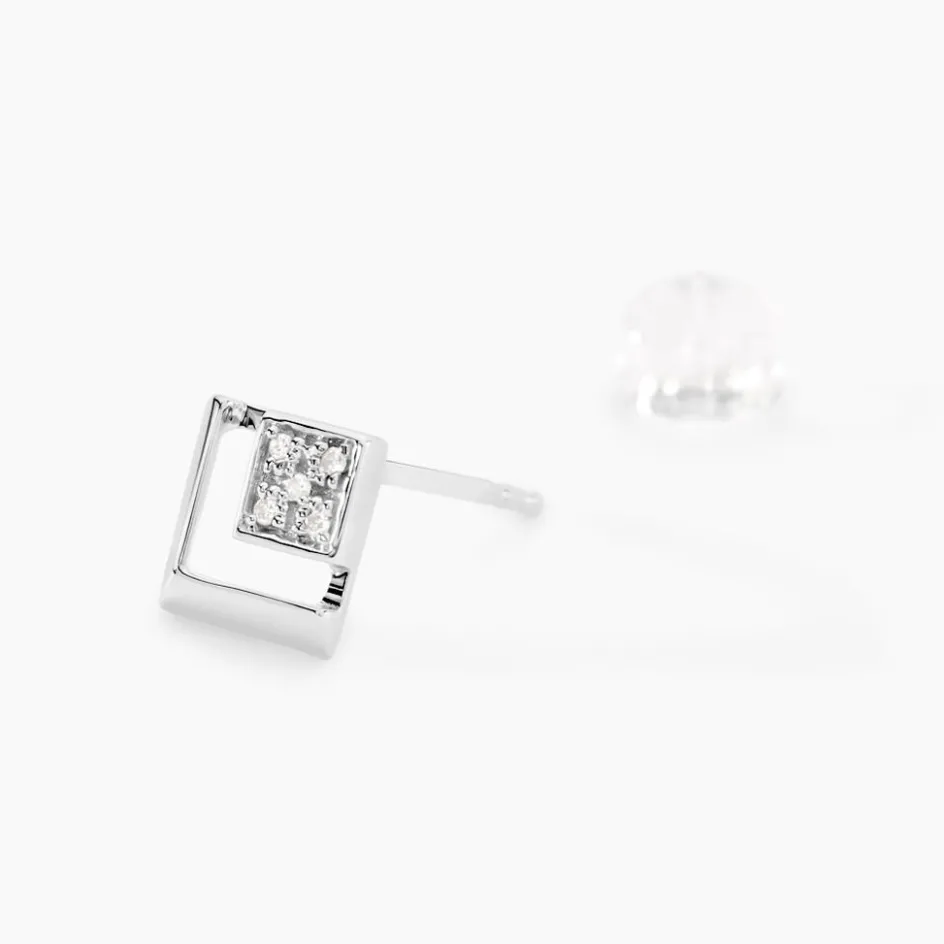 Boucles D’oreilles Or Blanc 375/1000 Puces Formes Losanges Ajoures + Semi Pavage Diamants