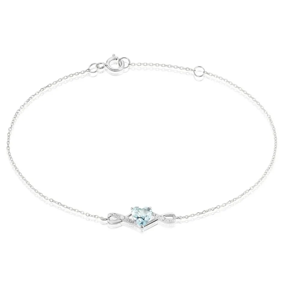 Bracelet Or Blanc 375/1000 Coeur Topaze 0.75cts Serti Griffes Maille Forcat 18cm