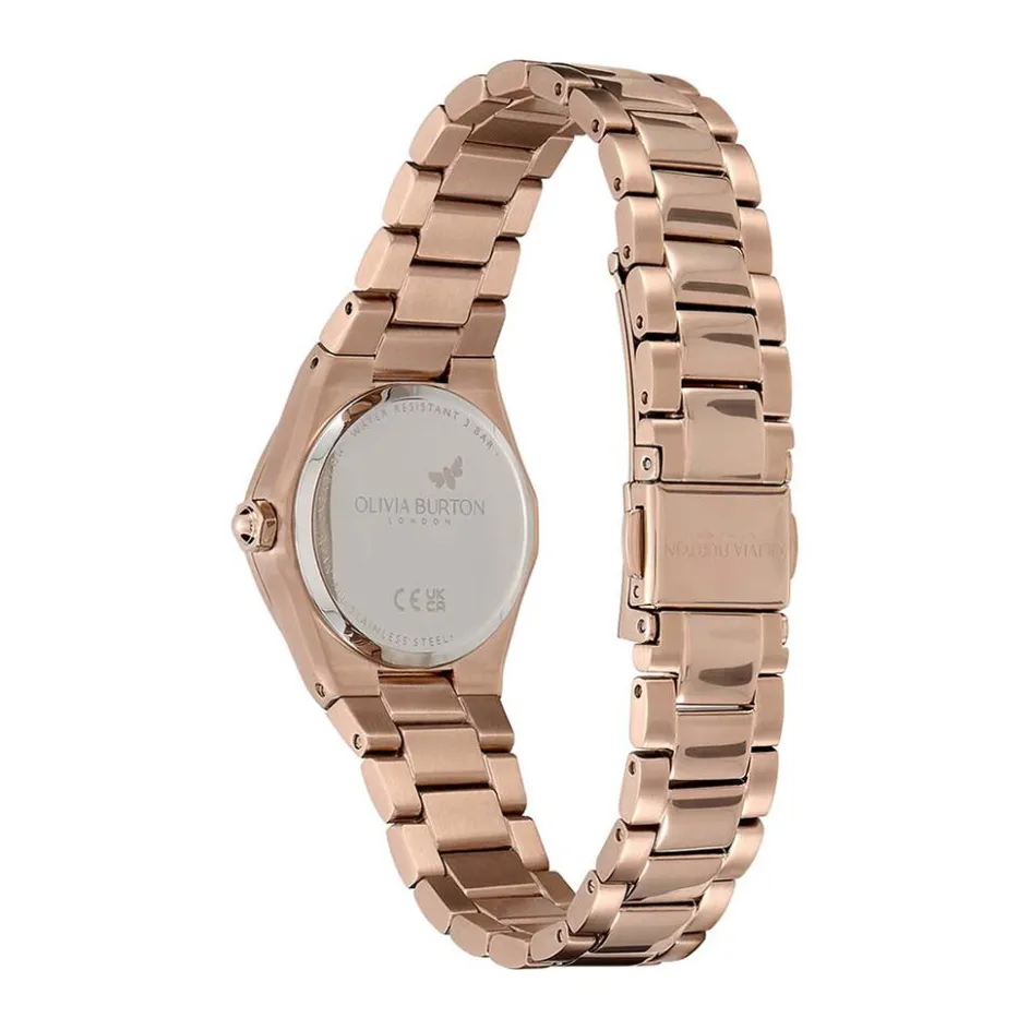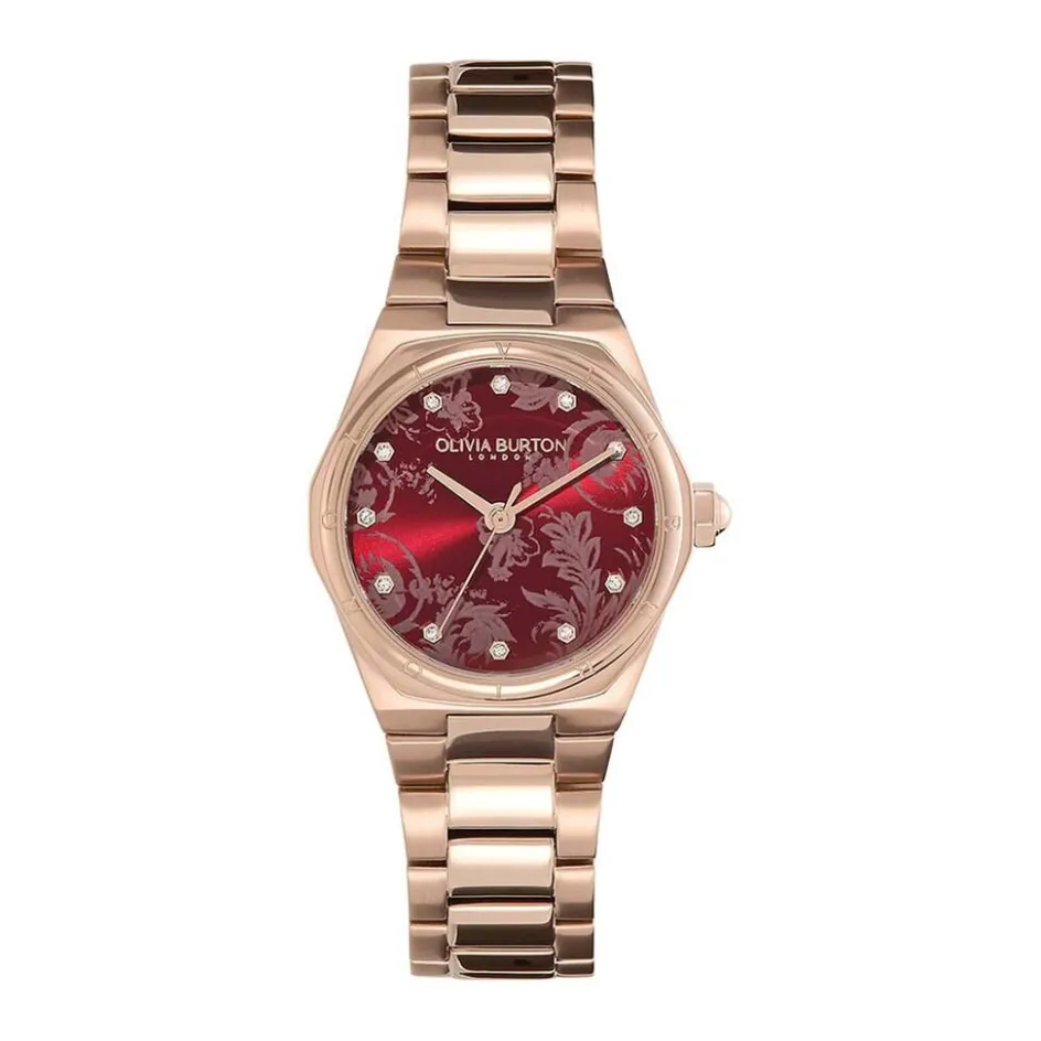 Montre Olivia Burton Mini Hexa Acier Rose Ronde Quartz 28mm Fond Bordeaux Motif Fleurs Bracelet Acier Rose 24000106
