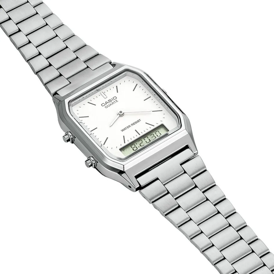 Montre Casio Collection Vintage Resine Blanc Rectangulaire Quartz 38.8mm Fond Blanc Bracelet Acier Blanc Aq-230a-7dmqyes