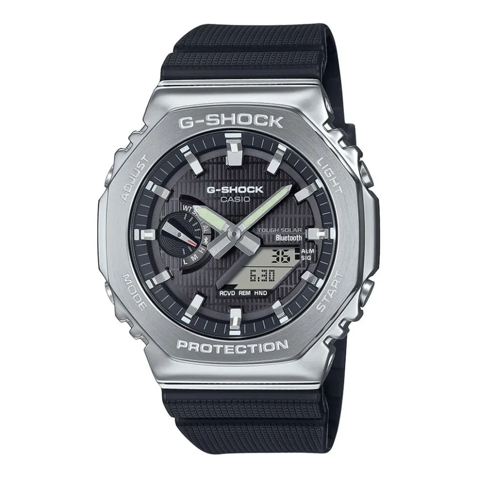 Montre Casio Resine Argente Ronde Quartz Solaire 44.4mm Fond Noir Bracelet Resine Noir Gbm-2100-1aer