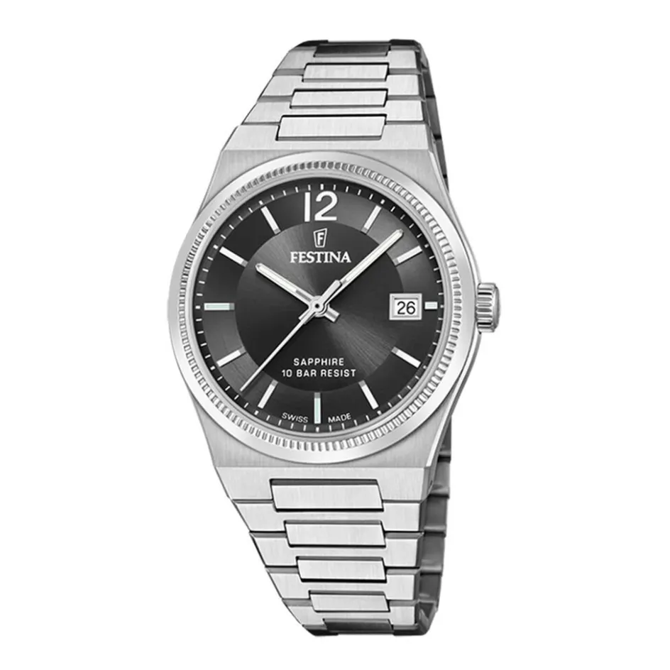Montre Festina Swiss Made Acier Argente Ronde Quartz 35mm Lunette Ciselee Fond Noir Bracelet Acier Argente F20035/6