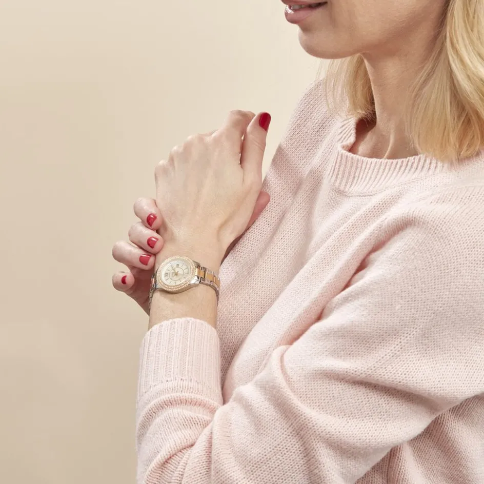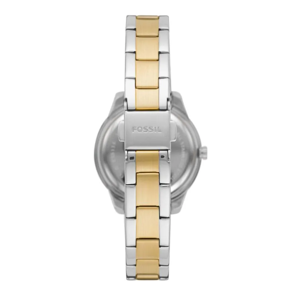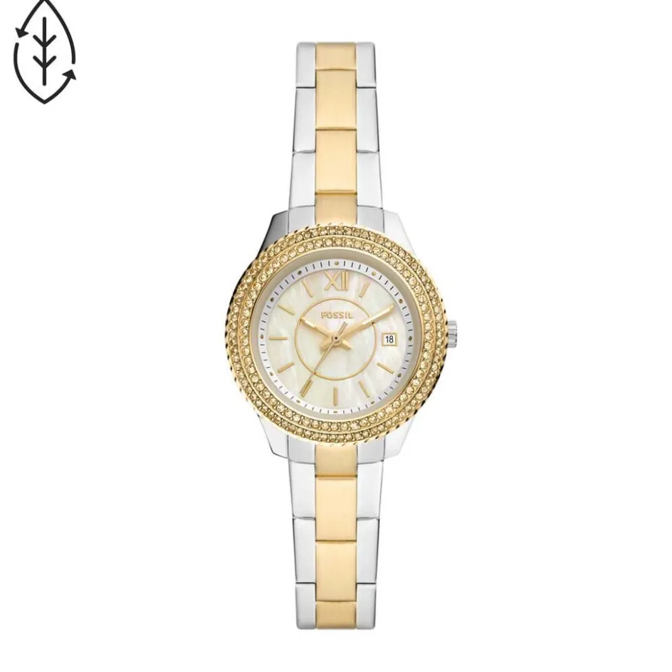 Montre Fossil Stella Acier Blanc Ronde Quartz Fond Nacré Blanc Lunette Dorée Strass Bracelet Acier Bicolore Es5138