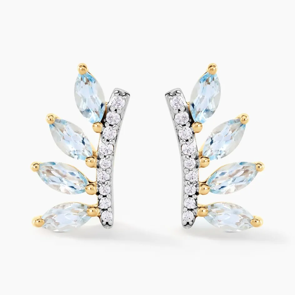 Boucles D’oreilles Puces Or Jaune 375/1000 Petales Topaze Bleu Sky Navette 0.72cts Pavage Oxyde De Zirconium