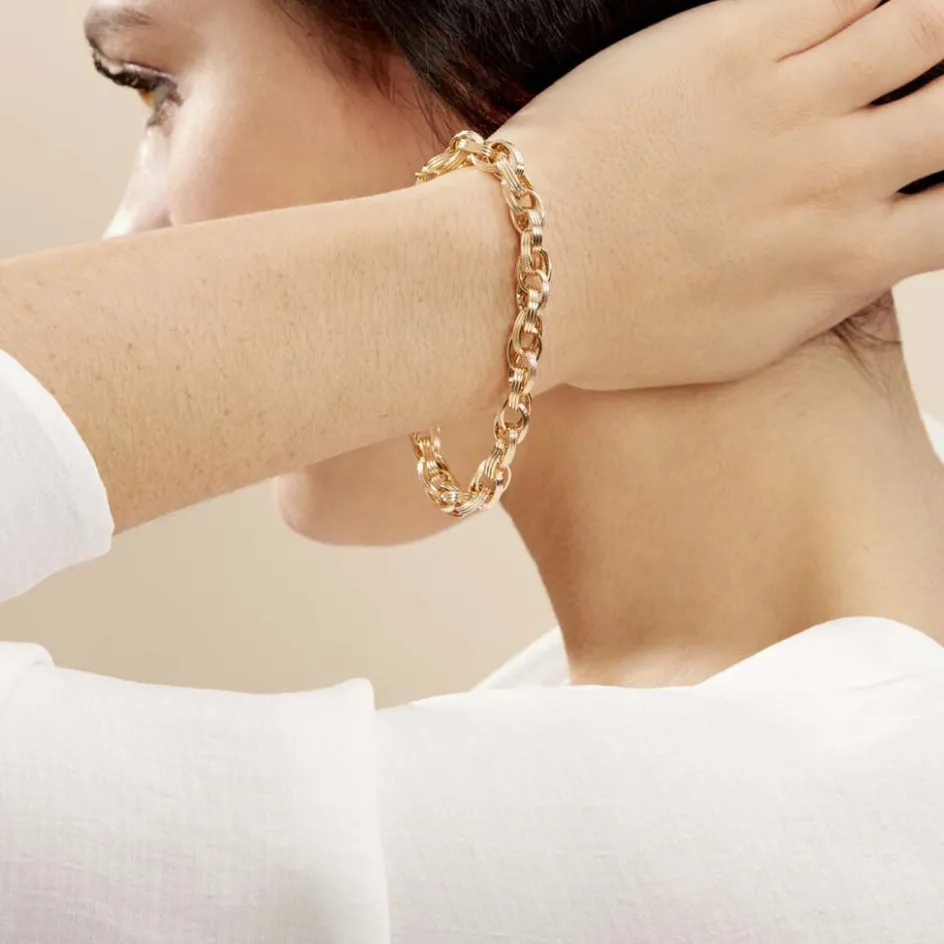 Bracelet Or Jaune 375/1000 Maillons Ovales Fil Plat Lisses Et Diamantes 8.3mm 19cm