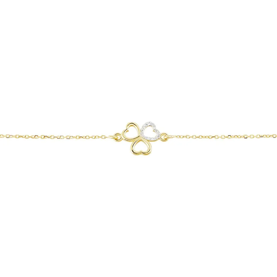 Bracelet Or Jaune 375/1000 Triple Coeurs Motif Trefle Dont 1 C艙ur Glitter Argente Maille Jaseron 16+2cm