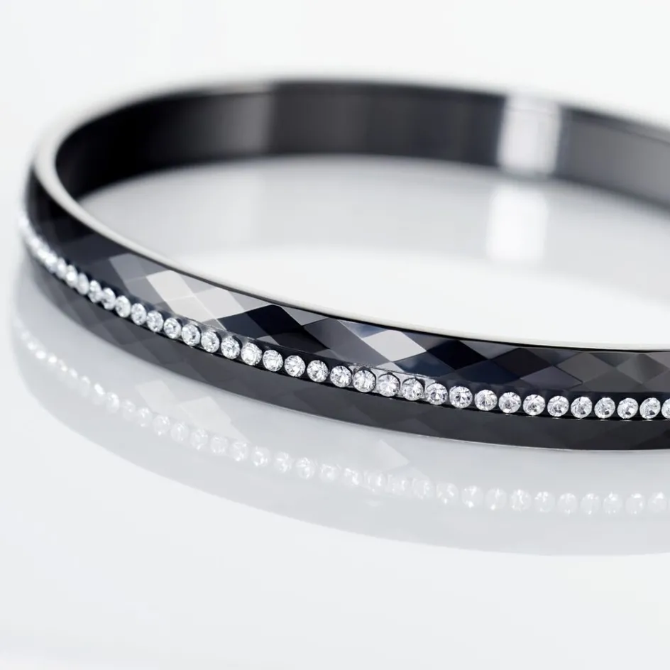 Bracelet Jonc Ceramique Facettee Noire Rang Pierres Blanches 6mm